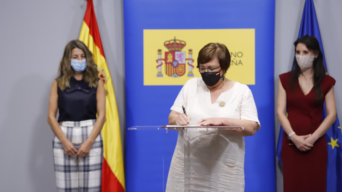 Las ministras de Trabajo y Economía Social, Yolanda Díaz, e Igualdad, Irene Montero, la secretaria de Acción Sindical de CCOO, Mari Cruz Vicente, y la vicesecretaria general de UGT, Cristina Antoñanzas, han firmado hoy el acuerdo para el desarrollo de la igualdad efectiva en el trabajo entre hombres y mujeres que completa la Ley Orgánica de igualdad y el RDL 6/2019. En su intervención en el acto de firma, la secretaria de Acción Sindical de CCOO, Mari Cruz Vicente, ha destacado que “se trata de una buena herramienta para negociar con garantías los planes de igualdad e implantar el registro salarial en las empresas”.